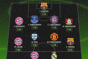 中场/边锋:奥利塞(拜仁)、帕斯(科莫)、B费(曼联)、亚马尔(巴萨)