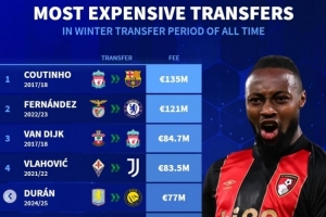 冬窗转会最贵榜:库鸟、恩佐、范戴克、DV9列前四,塞梅尼奥第7